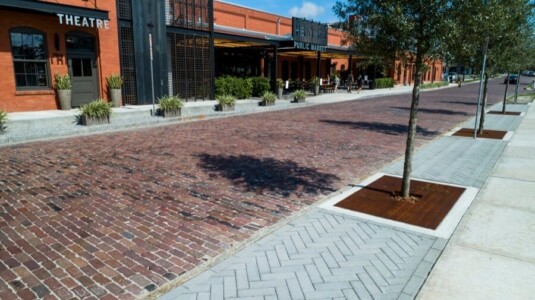 Type of pavers used: Historic clay road bricks, new clay vehicular pavers from Oldcastle and new concrete plank pavers from Tremron